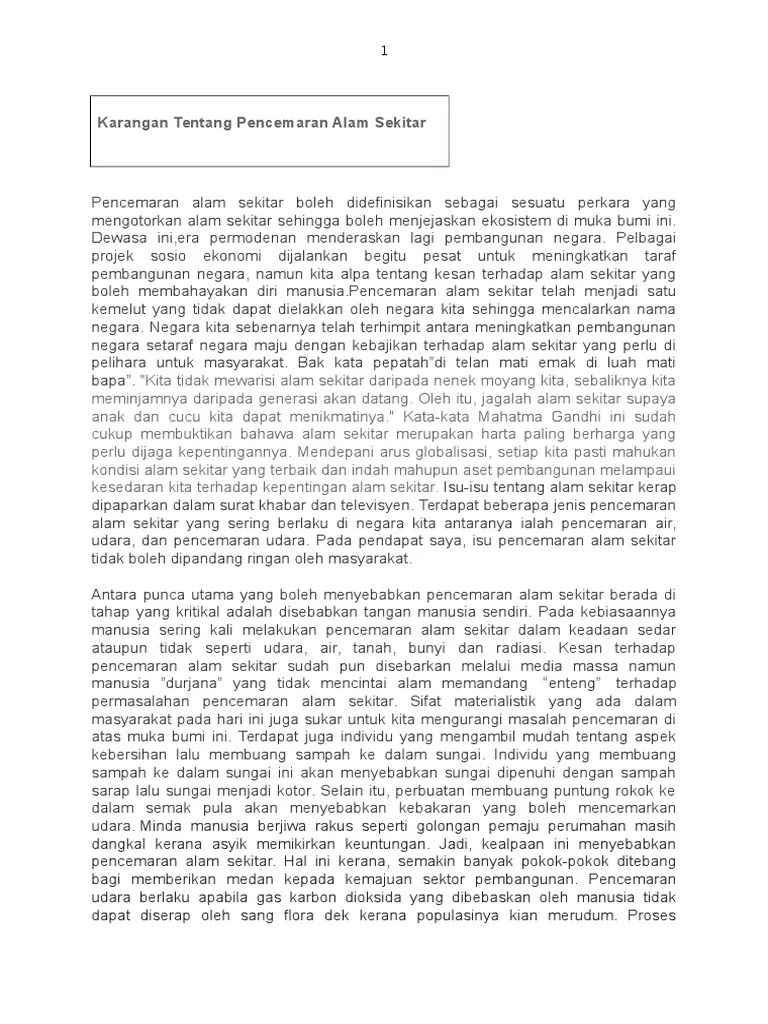 Karangan Pencemaran Alam Sekitar Upsr : Punca Pencemaran Alam Sekitar Karangan Spm. Alam sekitar kita semakin tercemar. Alam sekitar semakin tercemar dan itu merupakan realiti yang harus kita semua sedari. Pencemaran alam boleh ditakrifkan sebagai kotoran sekeliling yang menjejas kualiti kebersihan air, udara dan bumi. Asap daripada pembakaran terbuka boleh menyebabkan berlakunya jerebu yang . Selain itu, pembakaran terbuka juga menjadi punca berlakunya pencemaran alam. Pencemaran ini telah mendatangkan kesan buruk kepada hidupan sama ada manusia, haiwan atau tumbuhan. Pihak media massa turut sama .